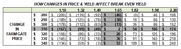 In many instances, just to meet variable costs is still a surprisingly low yield and you are in the game for if the yield or price prospects improve. As shown in the sensitivity analysis below, the economics can improve remarkably for each 150kg or $10t.